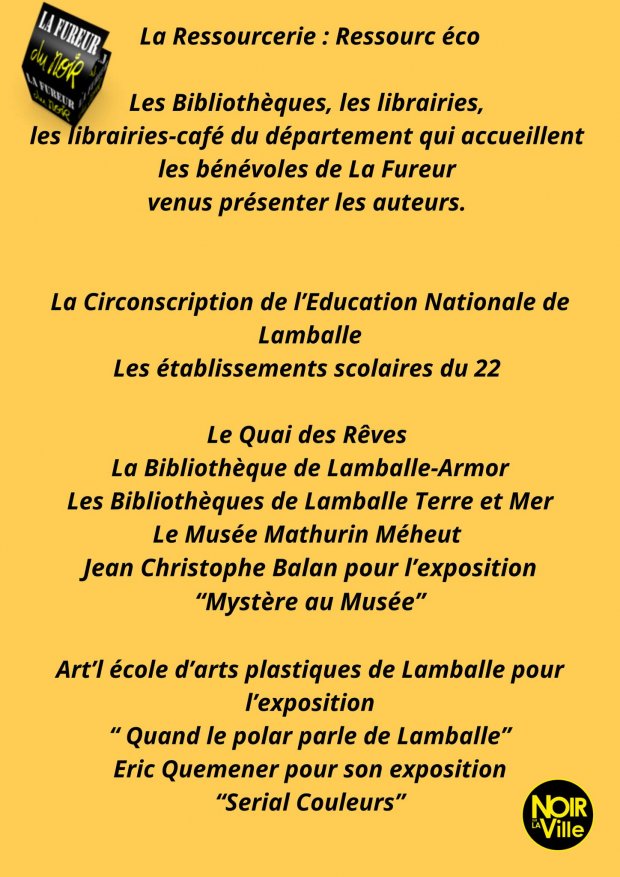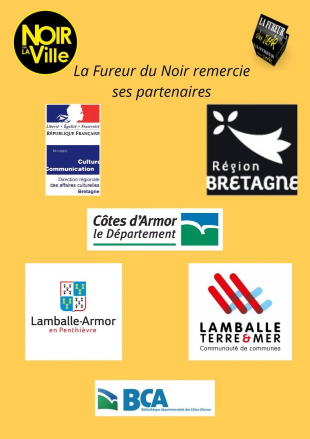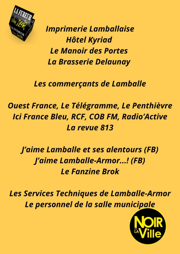 La Fureur du Noir tient à remercier le nombreux Public venu sur le salon Noir sur la Ville, les partenaires : La Ville de Lamballe, Lamballe-Communauté, le Conseil Départemental, le Conseil Régional, la DRAC, Christine notre sénatrice, La SOFIA, la SNCF, les Vitrines de Lamballe, la Ville de Pordic et La Noiraude, les libraires : la Nouvelle Librairie de St Brieuc, la Çédille de Lamballe, Le Grenier de Dinan. Ouest France, Le Télégramme, Le Penthièvre, Le Cri de l’Ormeau. L’Imprimerie Lamballaise, Lucas Traiteur, le Kyriad, Le Lion d’Or.
